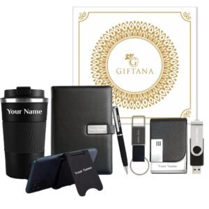 Giftana Personalized Pen with Diary, Keychain, Card Holder, Mobile Stand, Pen Drive, Coffee Tumbler Set with Name 7 in 1 Personalised Gift for Husband,Father,Diwali Corporate Gift for Employee- Black