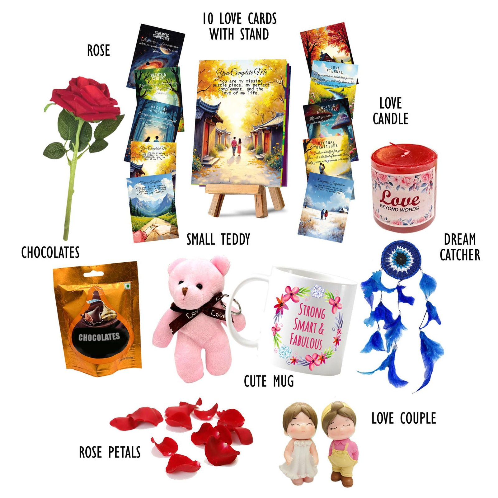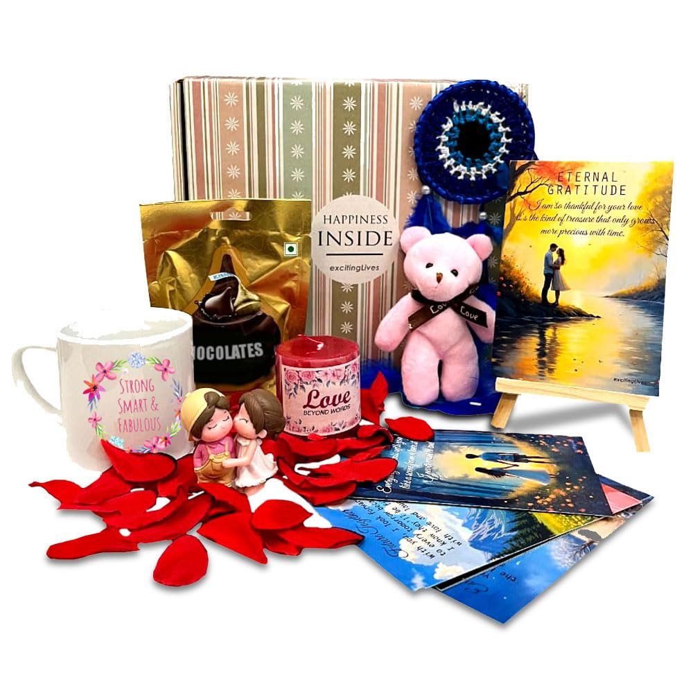 Details: “Make this Valentine’s Day unforgettable with the ExcitingLives Valentine Gift Hamper—an elegant, romantic, and thoughtfully curated bundle designed to express love in the sweetest way. This premium hamper includes a charming mix of adorable, heartfelt, and indulgent items such as a soft pink teddy bear, delicious Hershey’s Kisses chocolates, a beautifully scented candle, decorative rose petals, a motivational mug, romantic couple miniature figurines, and multiple love-themed greeting cards. Every item is chosen to help you create a magical and emotional experience for your partner. The hamper also includes a stunning artwork card placed on a mini easel, making it a memorable keepsake that your loved one can display proudly. From cozy moments to sweet surprises, this hamper is perfect for celebrating Valentine’s Day, anniversaries, birthdays, or simply making your special someone feel cherished. Packed in an attractive, premium gift box labeled “Happiness Inside,” this hamper is ready to gift and ideal for wives, girlfriends, fiancées, or anyone you want to shower with affection. Give the gift of love, warmth, and thoughtful surprises with this all-in-one romantic Valentine’s hamper.”
