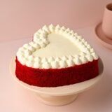 - The cake’s appearance is nothing short of breathtaking. Its heart shape speaks of love, while the deep red velvet color is a feast for the eyes, symbolizing passion and depth. The contrast with the pristine white frosting dollops is visually striking, creating an aesthetic that’s both elegant and inviting.