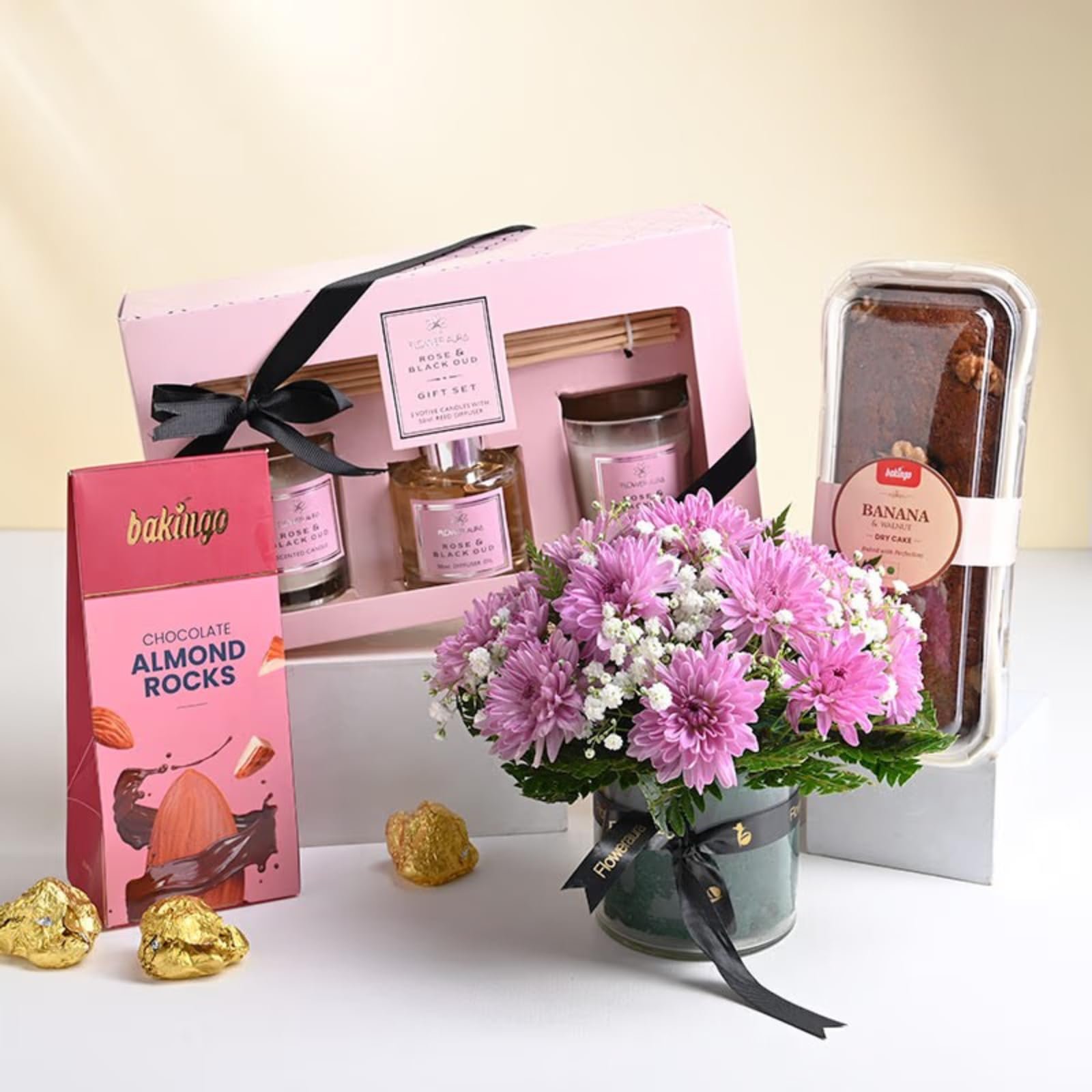FlowerAura Hamper Include Fresh Live 2 Stem of Daisy Flowers, Diffuser Set, Chocolate Pack, Tea Cake For Birthday Gift, Anniversary Gift, Mother’s Day Gift & Special Occasions Gift (Same Day Delivery)