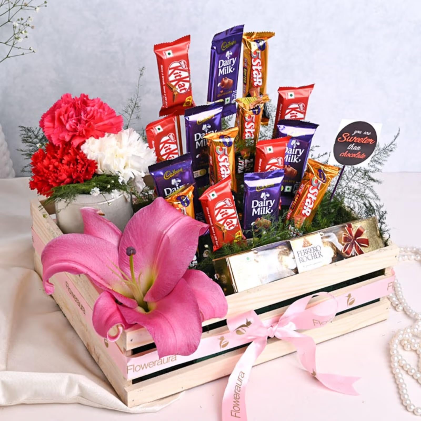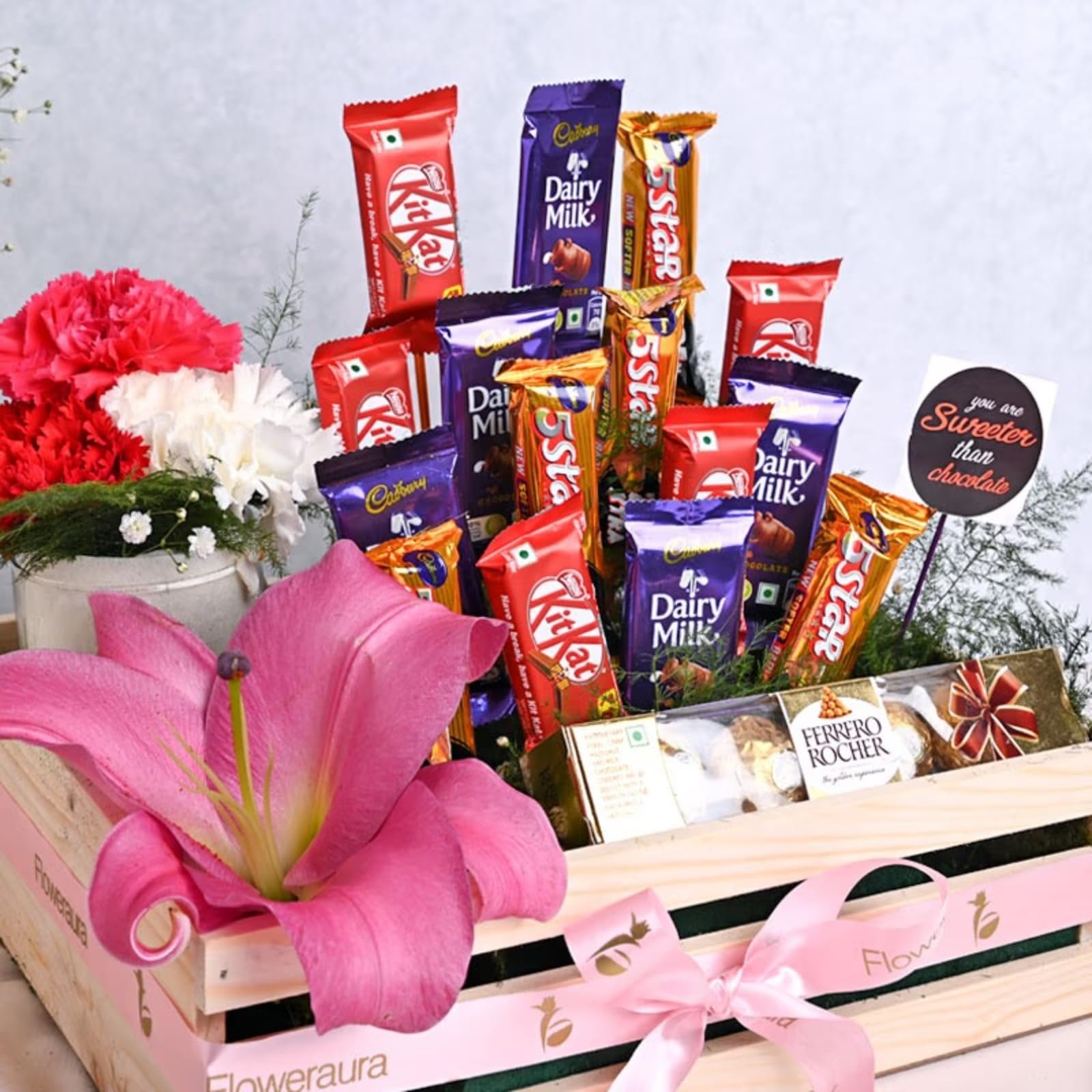 FlowerAura Love Hamper of Fresh Live 4 Mix Flowers with 19 Mix Chocolates in Basket for Birthday, Valentine’s Day Gift for Boyfriend, Girlfriend, Wife & Husband (Same Day Delivery)