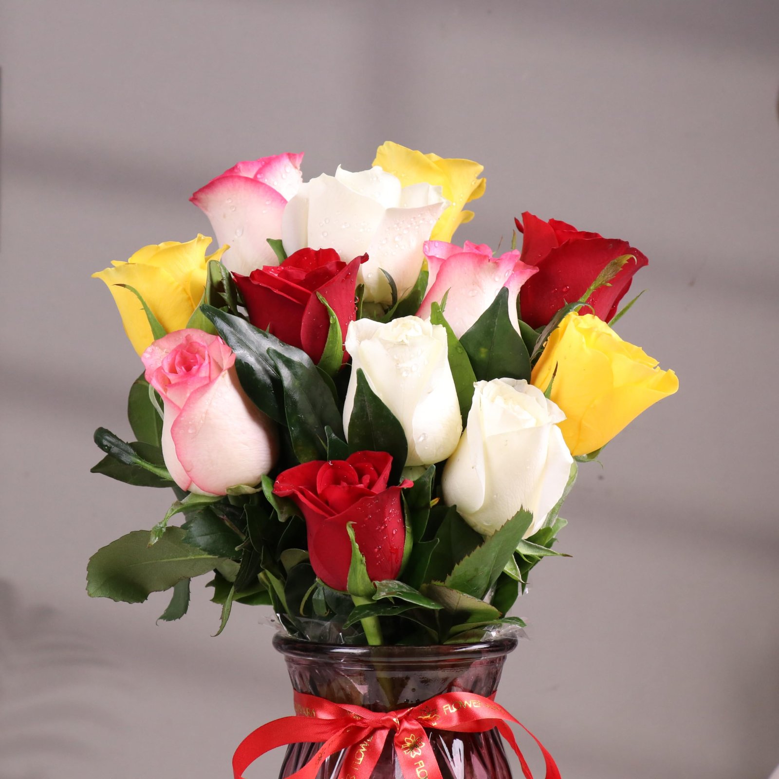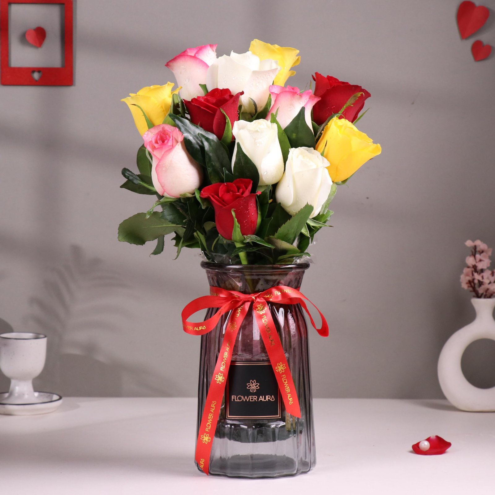 FlowerAura Premium Fresh Live Flower Bouquet of 12 Mix Roses In Glass Vase Gift For Birthday | Anniversary | Romantic Surprise | Rose Day | Valentine’s Day (Same Day Delivery)