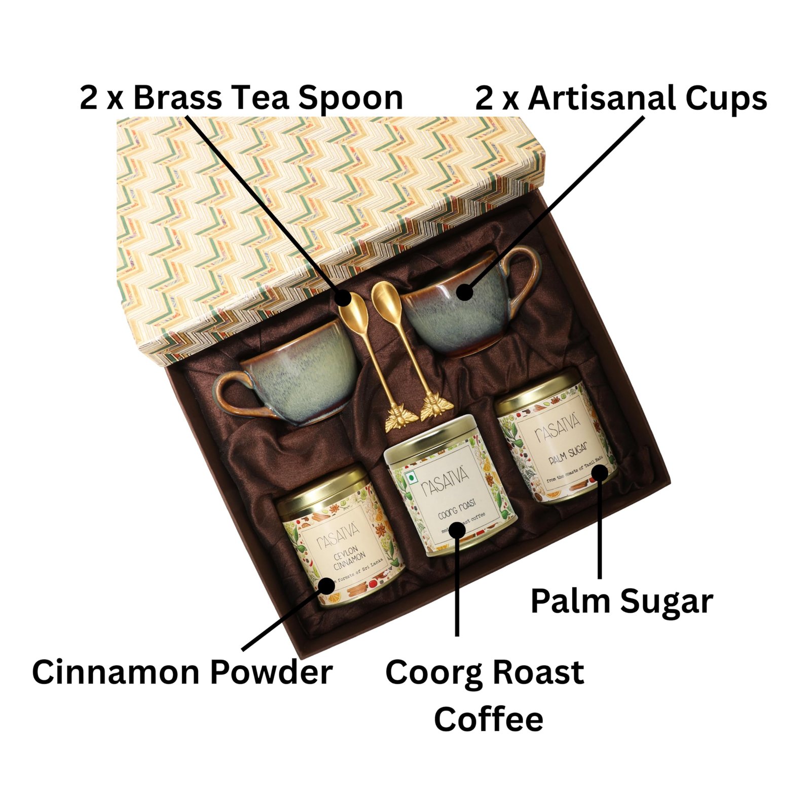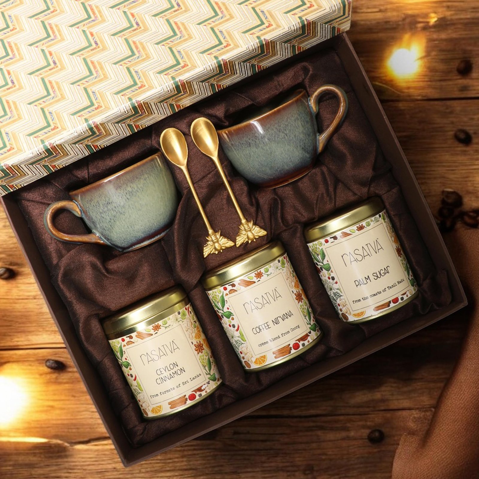 Details: Treat someone special to the ultimate coffee indulgence with this elegantly presented gift set. Nestled in a luxurious satin-lined custom-made box, the rich Coffee Blend takes center stage, complemented by the warm spice of Ceylon cinnamon and the natural sweetness of palm sugar. The experience is elevated with two artisanal mugs and designer brass teaspoons, making every sip feel sophisticated and memorable. Perfect for coffee connoisseurs who appreciate quality and style.
