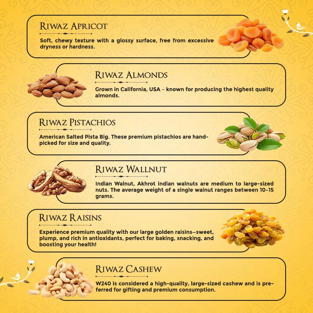 - A Grand and Diverse Dry Fruit Assortment: The hamper features a generous selection of six different dry fruits, each in its own airtight jar. The assortment includes Almonds, Cashews, Pistachios, Walnuts, Raisins, and Khumani (dried apricots). This extensive variety ensures there’s something to please every palate, from the satisfying crunch of nuts to the unique sweetness of dried fruits. This comprehensive mix makes the gift both abundant and delightful.
