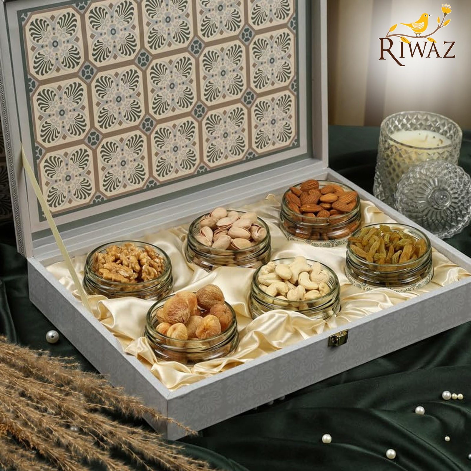 - Quality-Preserving Airtight Jars: Each of the six dry fruits is sealed in its own airtight jar. This crucial feature is designed to maintain the optimal freshness, crunch, and flavor of the contents. The airtight seal protects the nuts and dried fruits from moisture and air, ensuring they remain in perfect condition until they are consumed. The jars are also reusable, offering a practical and sustainable bonus for the recipient.