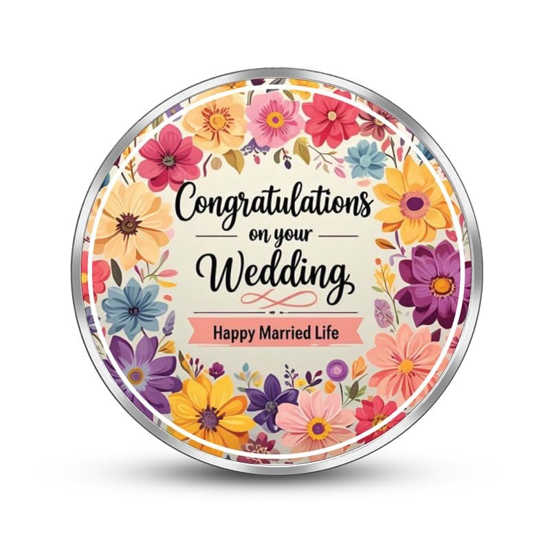 • PRODUCT DETAILS : BIS Hallmarked 999 Pure Silver Wedding Congratulations Coin. Features One Side customisation with Custom Message, a stunning mirror finish, and an elegant design.