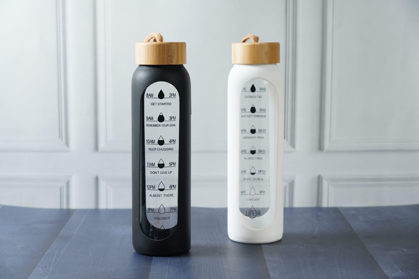 • 💧 1L Glass Bottle with Hydration Markings – Stylish bottle with non-slip rubber sleeve and time-marked reminders to stay hydrated.