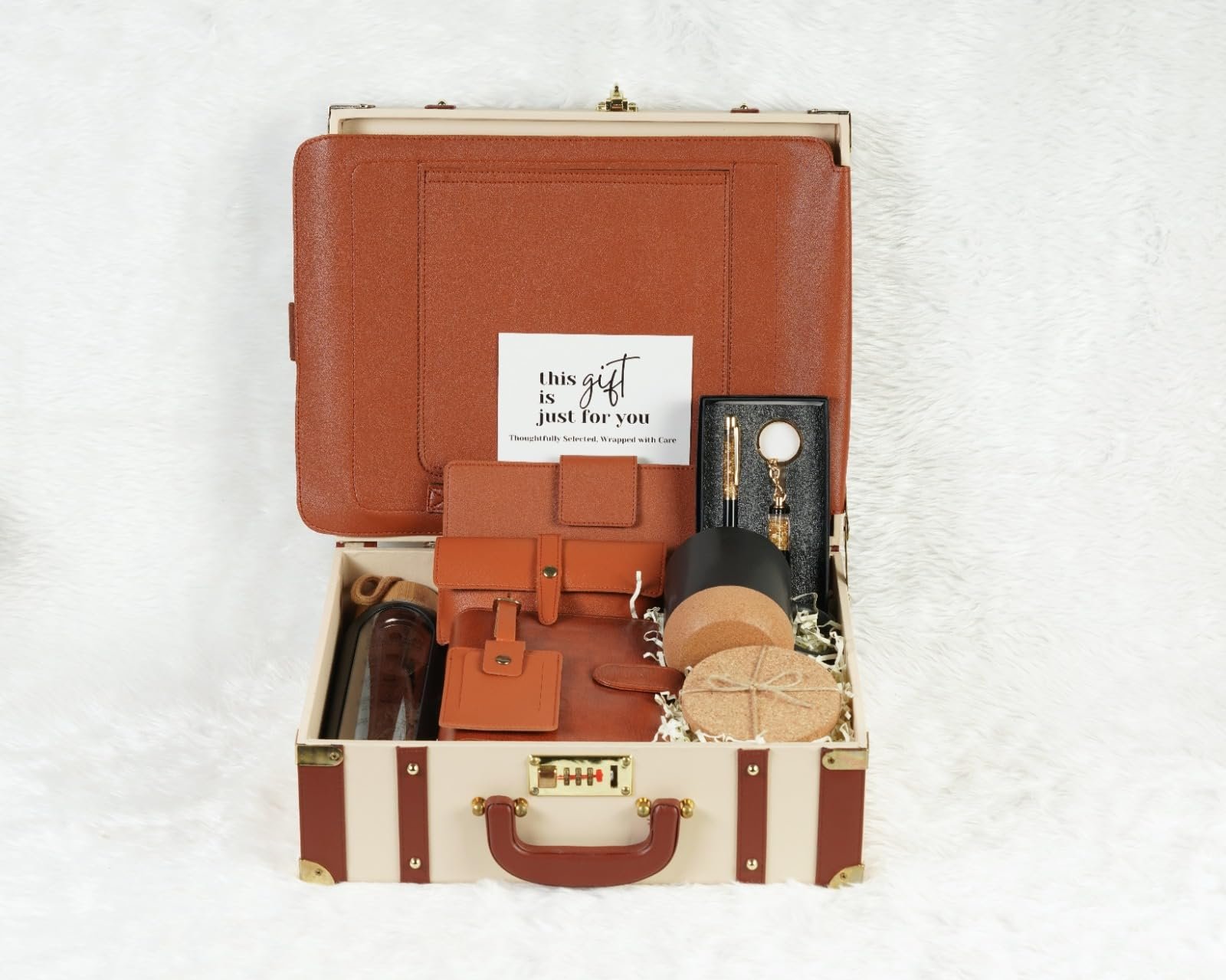 Details: This all-occasion hamper includes a multi-functional vegan leather laptop sleeve with magnetic stand and mouse pad feature, a 1-litre glass hydration bottle with reminder markers, a ceramic mug with cork base and lid, a diary, and a pen & keychain gift set. It also features travel accessories like a passport and cards organizer, eyewear case, wooden coaster set, and travel tag, making it a perfect gifting solution for birthdays, anniversaries, farewells, promotions, corporate gifts, or festive occasions.