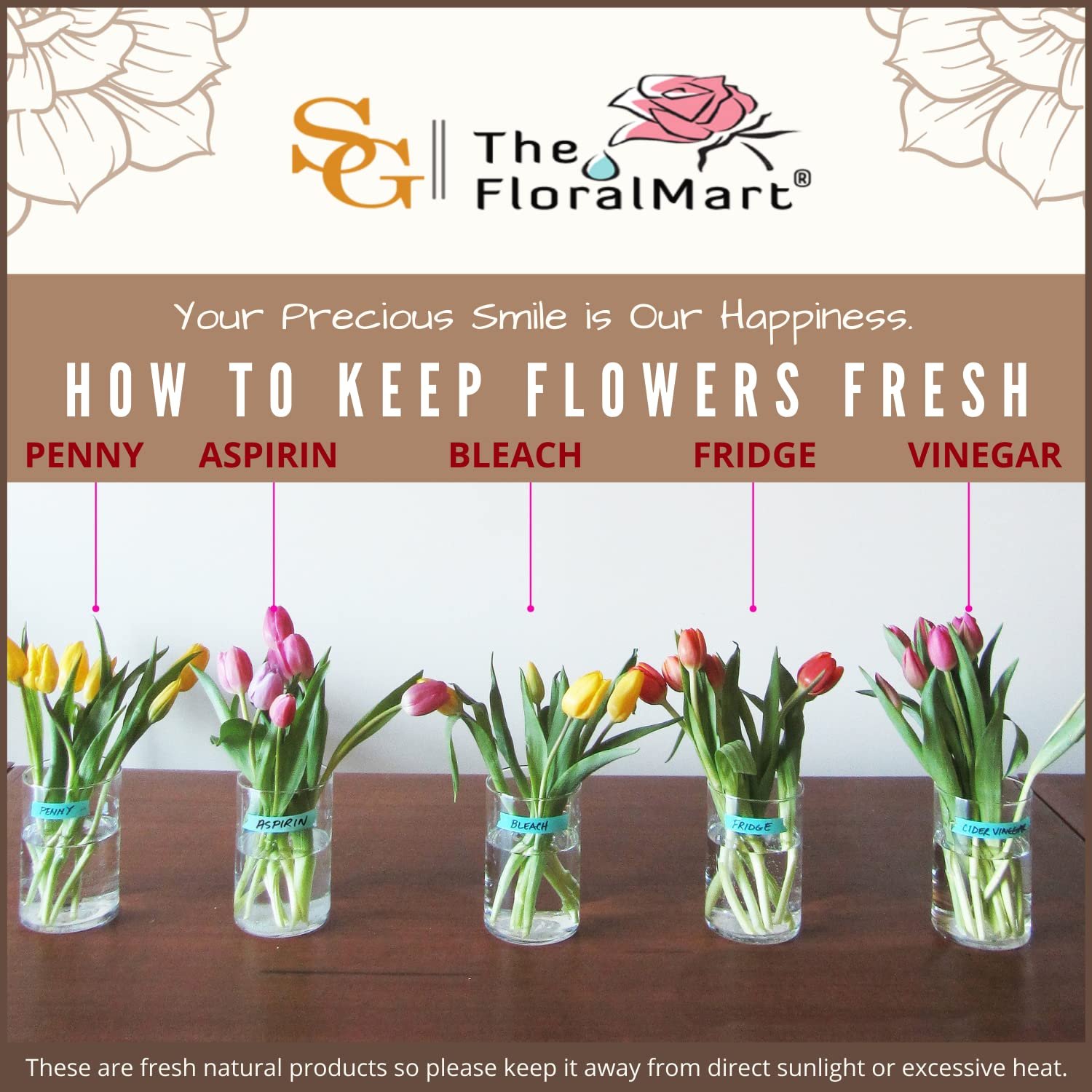 • Special Care: These are fresh flowers, please keep the flowers away from direct sunlight or near any other source of excessive heat and fire, please do not apply pressure